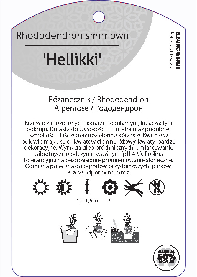 Etykieta zawieszana z gumką w rozmiarze 75×119 mm. Wykonana z polipropylenu o grubości 0,5 mm w 50% pochodzącego z recyklingu. Etykieta odporna na działanie czynników atmosferycznych. Całość dodatkowo zabezpieczona jest lakierem UV zapobiegającym utracie kolorów.