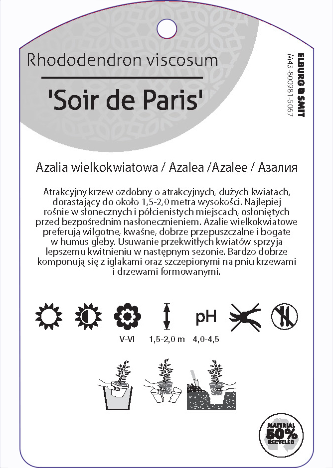 Etykieta zawieszana z gumką w rozmiarze 75×119 mm. Wykonana z polipropylenu o grubości 0,5 mm w 50% pochodzącego z recyklingu. Etykieta odporna na działanie czynników atmosferycznych. Całość dodatkowo zabezpieczona jest lakierem UV zapobiegającym utracie kolorów.