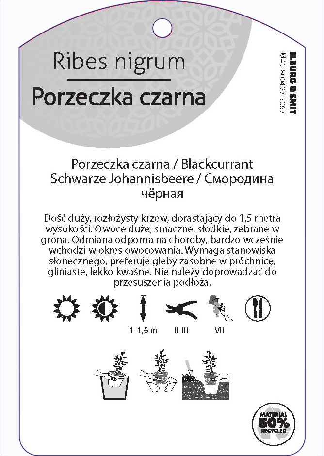 Etykieta zawieszana z gumką w rozmiarze 75×119 mm. Wykonana z polipropylenu o grubości 0,5 mm w 50% pochodzącego z recyklingu. Etykieta odporna na działanie czynników atmosferycznych. Całość dodatkowo zabezpieczona jest lakierem UV zapobiegającym utracie kolorów.