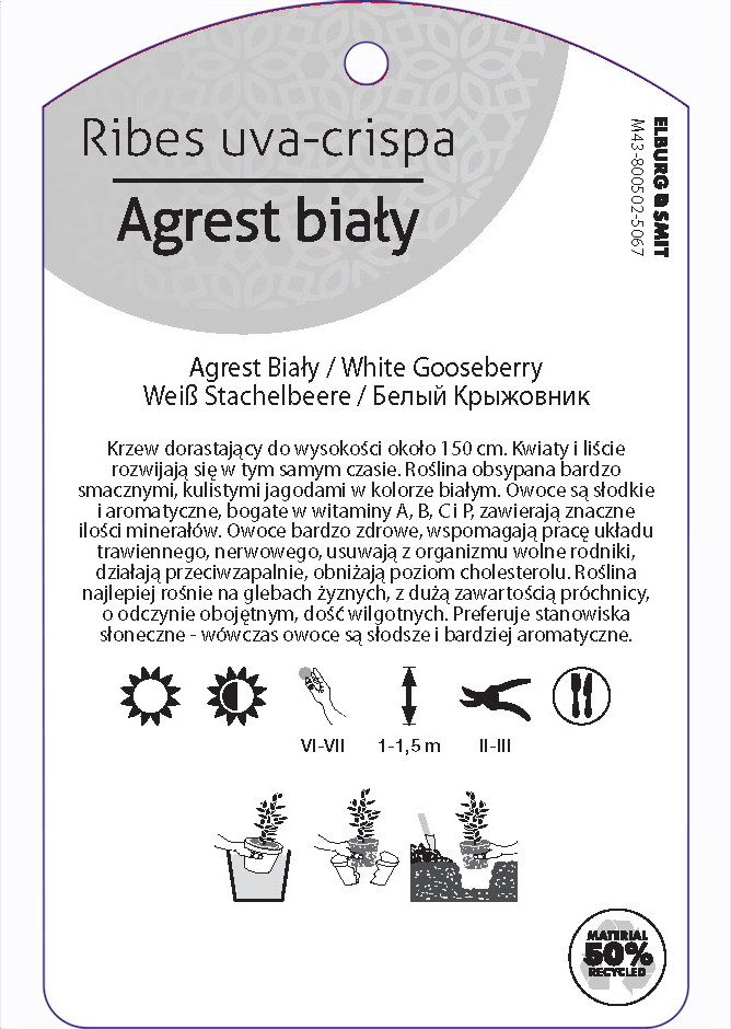 Etykieta zawieszana z gumką w rozmiarze 75×119 mm. Wykonana z polipropylenu o grubości 0,5 mm w 50% pochodzącego z recyklingu. Etykieta odporna na działanie czynników atmosferycznych. Całość dodatkowo zabezpieczona jest lakierem UV zapobiegającym utracie kolorów.