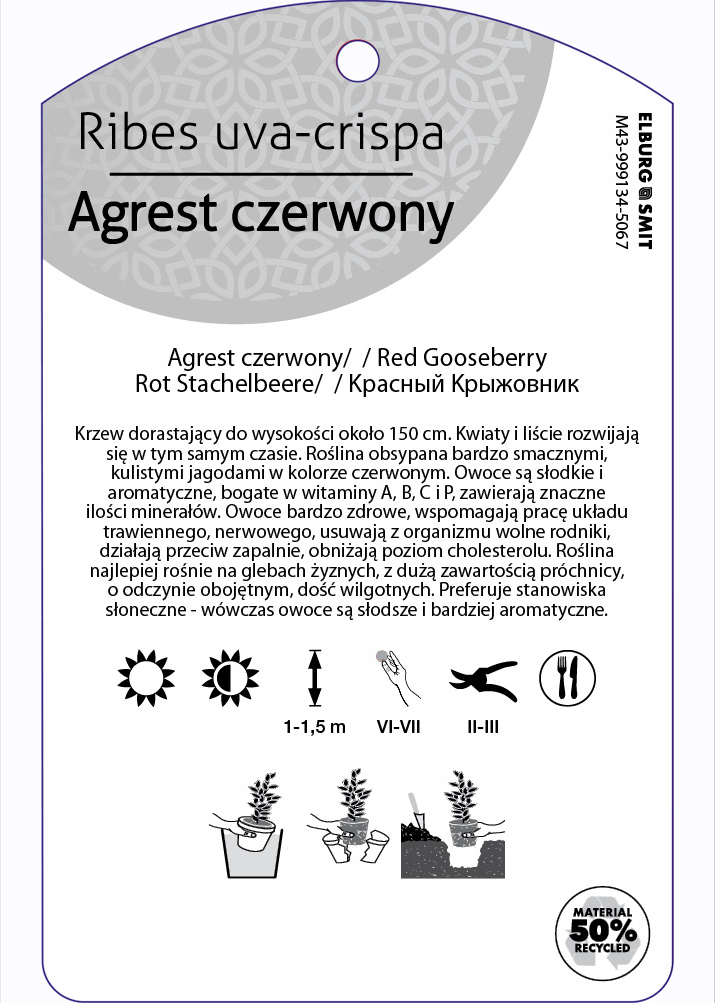 Etykieta zawieszana z gumką w rozmiarze 75×119 mm. Wykonana z polipropylenu o grubości 0,5 mm w 50% pochodzącego z recyklingu. Etykieta odporna na działanie czynników atmosferycznych. Całość dodatkowo zabezpieczona jest lakierem UV zapobiegającym utracie kolorów.