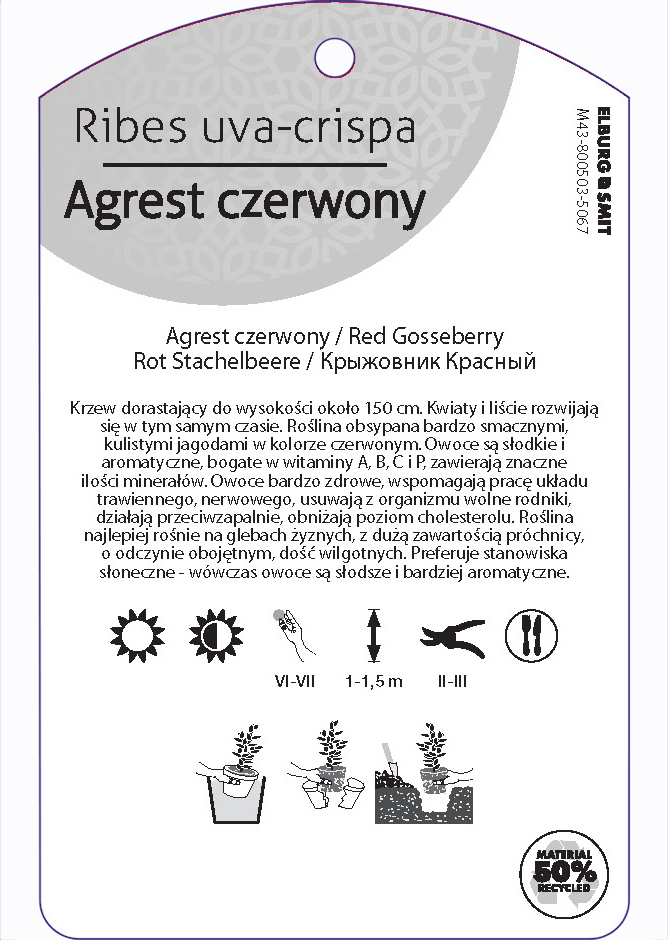Etykieta zawieszana z gumką w rozmiarze 75×119 mm. Wykonana z polipropylenu o grubości 0,5 mm w 50% pochodzącego z recyklingu. Etykieta odporna na działanie czynników atmosferycznych. Całość dodatkowo zabezpieczona jest lakierem UV zapobiegającym utracie kolorów.