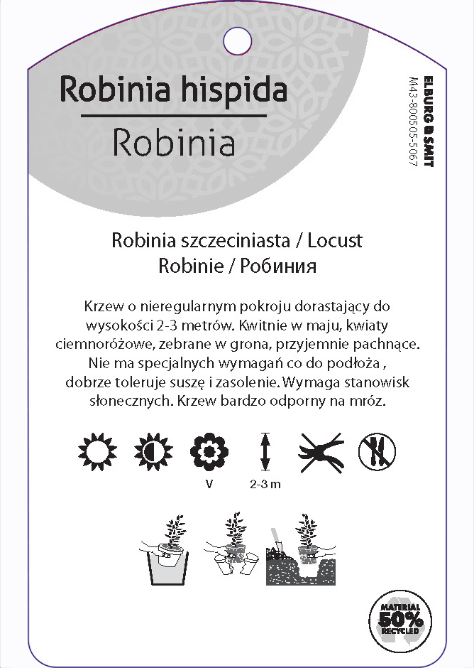 Etykieta zawieszana z gumką w rozmiarze 75×119 mm. Wykonana z polipropylenu o grubości 0,5 mm w 50% pochodzącego z recyklingu. Etykieta odporna na działanie czynników atmosferycznych. Całość dodatkowo zabezpieczona jest lakierem UV zapobiegającym utracie kolorów.