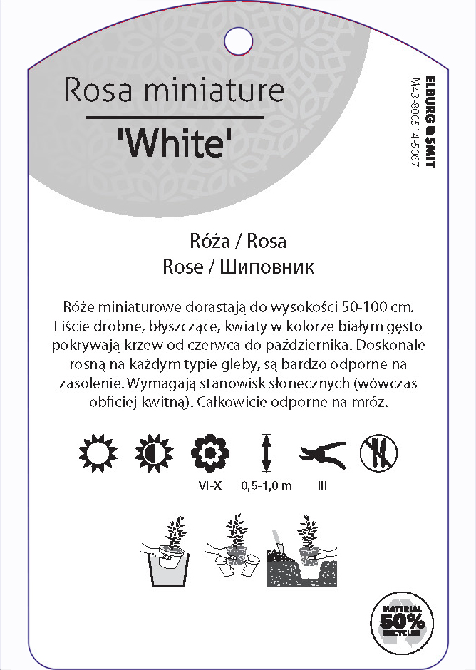 Etykieta zawieszana z gumką w rozmiarze 75×119 mm. Wykonana z polipropylenu o grubości 0,5 mm w 50% pochodzącego z recyklingu. Etykieta odporna na działanie czynników atmosferycznych. Całość dodatkowo zabezpieczona jest lakierem UV zapobiegającym utracie kolorów.