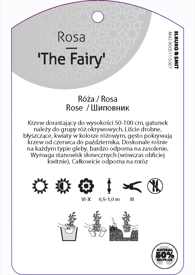 Etykieta zawieszana z gumką w rozmiarze 75×119 mm. Wykonana z polipropylenu o grubości 0,5 mm w 50% pochodzącego z recyklingu. Etykieta odporna na działanie czynników atmosferycznych. Całość dodatkowo zabezpieczona jest lakierem UV zapobiegającym utracie kolorów.