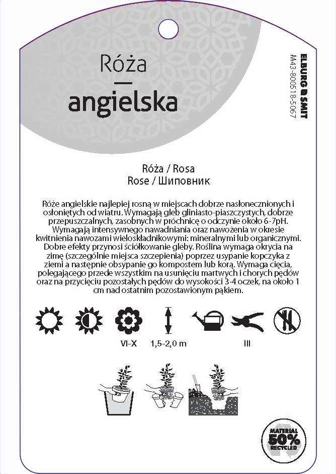 Etykieta zawieszana z gumką w rozmiarze 75×119 mm. Wykonana z polipropylenu o grubości 0,5 mm w 50% pochodzącego z recyklingu. Etykieta odporna na działanie czynników atmosferycznych. Całość dodatkowo zabezpieczona jest lakierem UV zapobiegającym utracie kolorów.