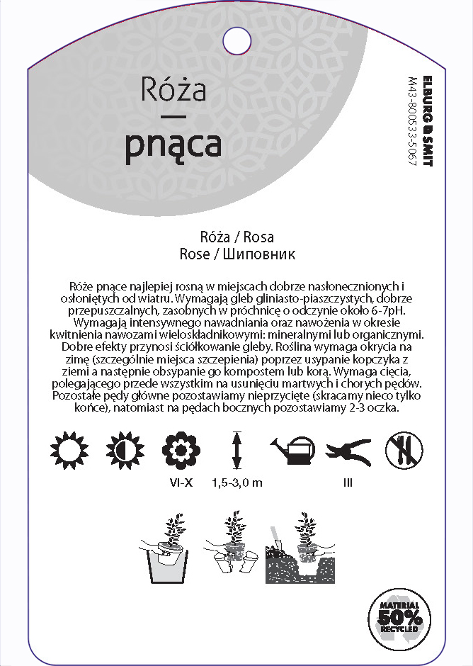 Etykieta zawieszana z gumką w rozmiarze 75×119 mm. Wykonana z polipropylenu o grubości 0,5 mm w 50% pochodzącego z recyklingu. Etykieta odporna na działanie czynników atmosferycznych. Całość dodatkowo zabezpieczona jest lakierem UV zapobiegającym utracie kolorów.