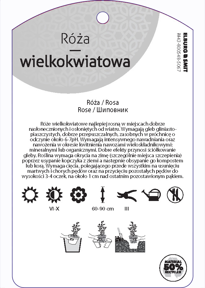 Etykieta zawieszana z gumką w rozmiarze 75×119 mm. Wykonana z polipropylenu o grubości 0,5 mm w 50% pochodzącego z recyklingu. Etykieta odporna na działanie czynników atmosferycznych. Całość dodatkowo zabezpieczona jest lakierem UV zapobiegającym utracie kolorów.