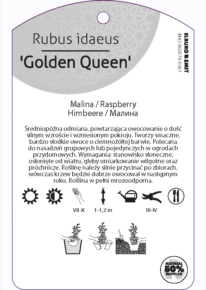 Etykieta zawieszana z gumką w rozmiarze 75×119 mm. Wykonana z polipropylenu o grubości 0,5 mm w 50% pochodzącego z recyklingu. Etykieta odporna na działanie czynników atmosferycznych. Całość dodatkowo zabezpieczona jest lakierem UV zapobiegającym utracie kolorów.
