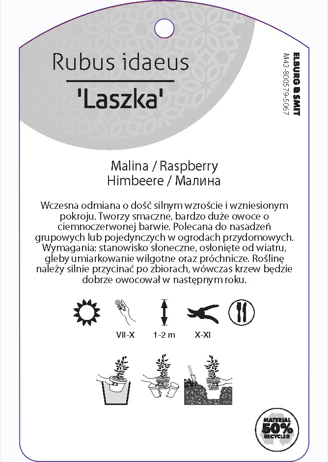 Etykieta zawieszana z gumką w rozmiarze 75×119 mm. Wykonana z polipropylenu o grubości 0,5 mm w 50% pochodzącego z recyklingu. Etykieta odporna na działanie czynników atmosferycznych. Całość dodatkowo zabezpieczona jest lakierem UV zapobiegającym utracie kolorów.
