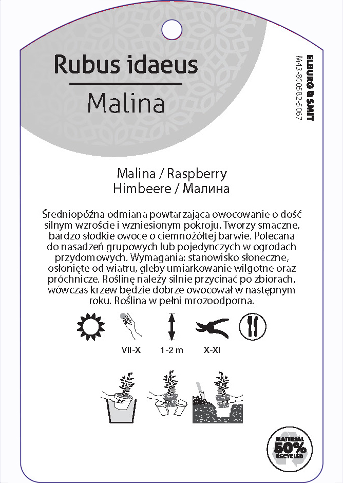Etykieta zawieszana z gumką w rozmiarze 75×119 mm. Wykonana z polipropylenu o grubości 0,5 mm w 50% pochodzącego z recyklingu. Etykieta odporna na działanie czynników atmosferycznych. Całość dodatkowo zabezpieczona jest lakierem UV zapobiegającym utracie kolorów.