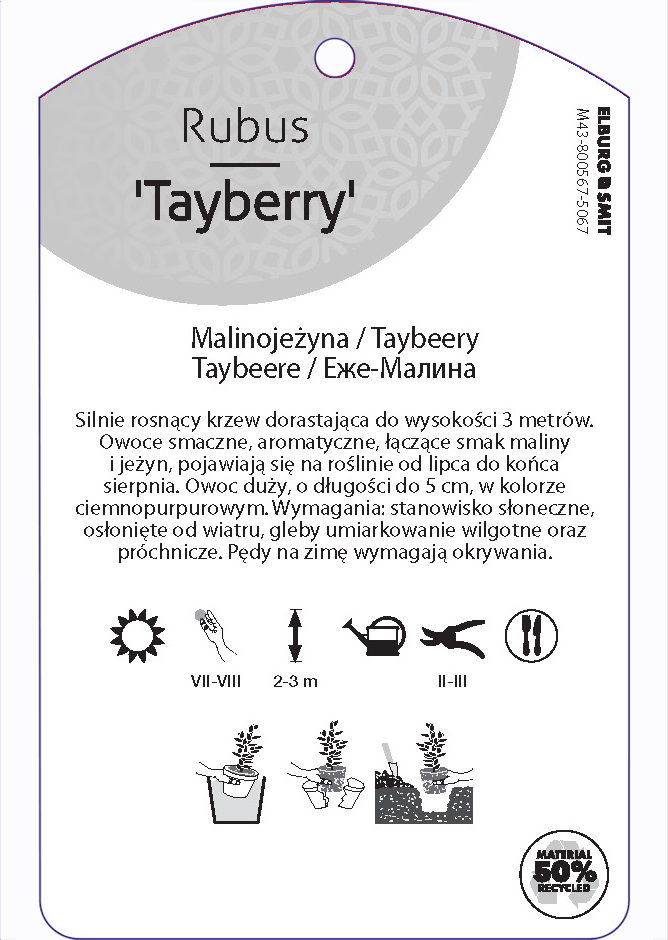 Etykieta zawieszana z gumką w rozmiarze 75×119 mm. Wykonana z polipropylenu o grubości 0,5 mm w 50% pochodzącego z recyklingu. Etykieta odporna na działanie czynników atmosferycznych. Całość dodatkowo zabezpieczona jest lakierem UV zapobiegającym utracie kolorów.