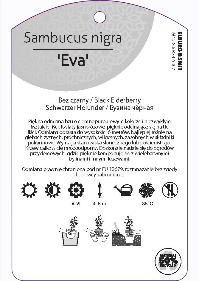 Etykieta zawieszana z gumką w rozmiarze 75×119 mm. Wykonana z polipropylenu o grubości 0,5 mm w 50% pochodzącego z recyklingu. Etykieta odporna na działanie czynników atmosferycznych. Całość dodatkowo zabezpieczona jest lakierem UV zapobiegającym utracie kolorów.