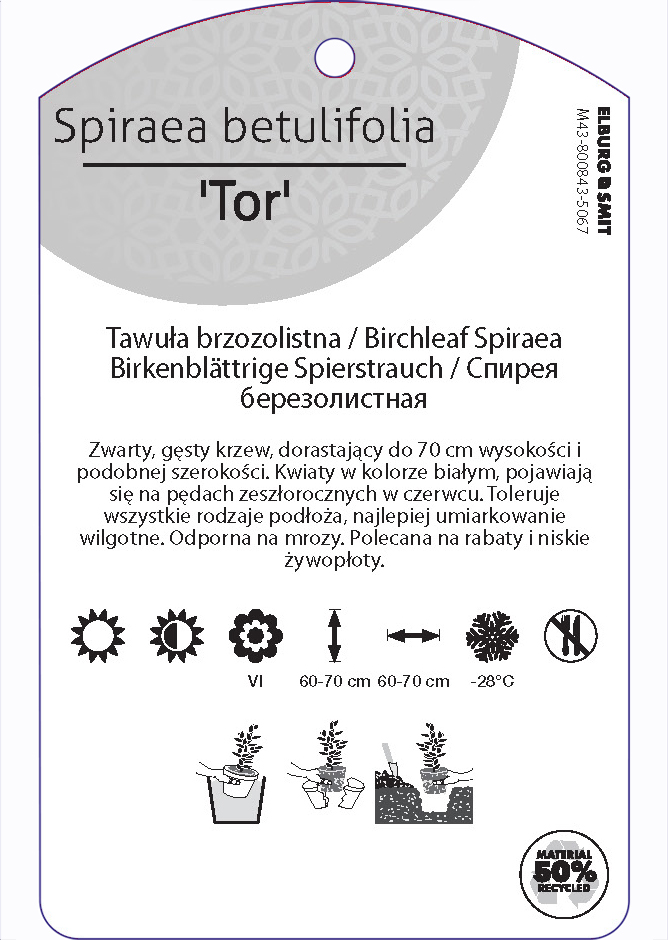 Etykieta zawieszana z gumką w rozmiarze 75×119 mm. Wykonana z polipropylenu o grubości 0,5 mm w 50% pochodzącego z recyklingu. Etykieta odporna na działanie czynników atmosferycznych. Całość dodatkowo zabezpieczona jest lakierem UV zapobiegającym utracie kolorów.