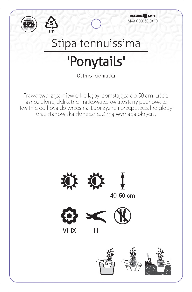 Etykieta zawieszana z gumką w rozmiarze 92×145 mm. Wykonana z polipropylenu o grubości 0,5 mm w 50% pochodzącego z recyklingu. Etykieta odporna na działanie czynników atmosferycznych. Całość dodatkowo zabezpieczona jest lakierem UV zapobiegającym utracie kolorów.