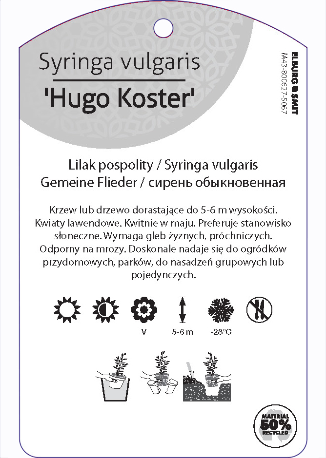 Etykieta zawieszana z gumką w rozmiarze 75×119 mm. Wykonana z polipropylenu o grubości 0,5 mm w 50% pochodzącego z recyklingu. Etykieta odporna na działanie czynników atmosferycznych. Całość dodatkowo zabezpieczona jest lakierem UV zapobiegającym utracie kolorów.