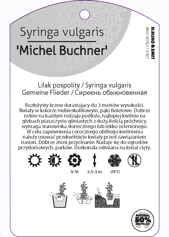 Etykieta zawieszana z gumką w rozmiarze 75×119 mm. Wykonana z polipropylenu o grubości 0,5 mm w 50% pochodzącego z recyklingu. Etykieta odporna na działanie czynników atmosferycznych. Całość dodatkowo zabezpieczona jest lakierem UV zapobiegającym utracie kolorów.