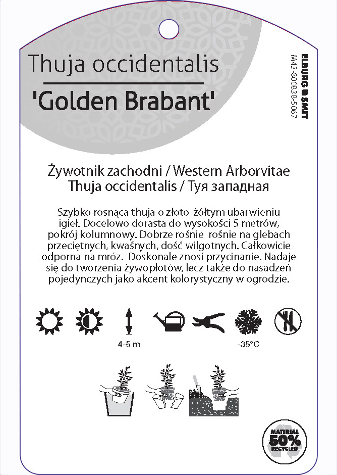 Etykieta zawieszana z gumką w rozmiarze 75×119 mm. Wykonana z polipropylenu o grubości 0,5 mm w 50% pochodzącego z recyklingu. Etykieta odporna na działanie czynników atmosferycznych. Całość dodatkowo zabezpieczona jest lakierem UV zapobiegającym utracie kolorów.