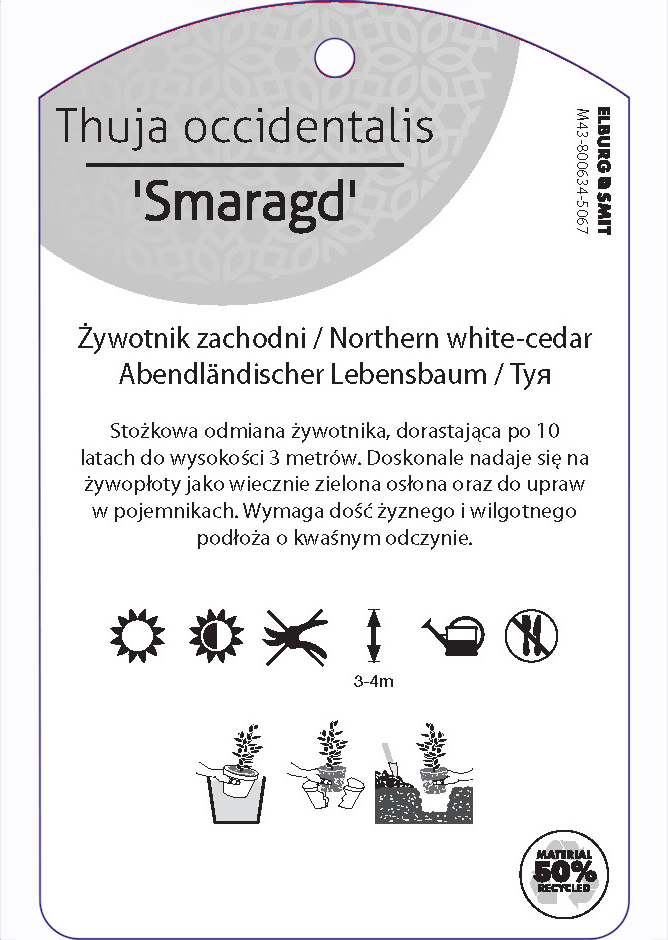 Etykieta zawieszana z gumką w rozmiarze 75×119 mm. Wykonana z polipropylenu o grubości 0,5 mm w 50% pochodzącego z recyklingu. Etykieta odporna na działanie czynników atmosferycznych. Całość dodatkowo zabezpieczona jest lakierem UV zapobiegającym utracie kolorów.