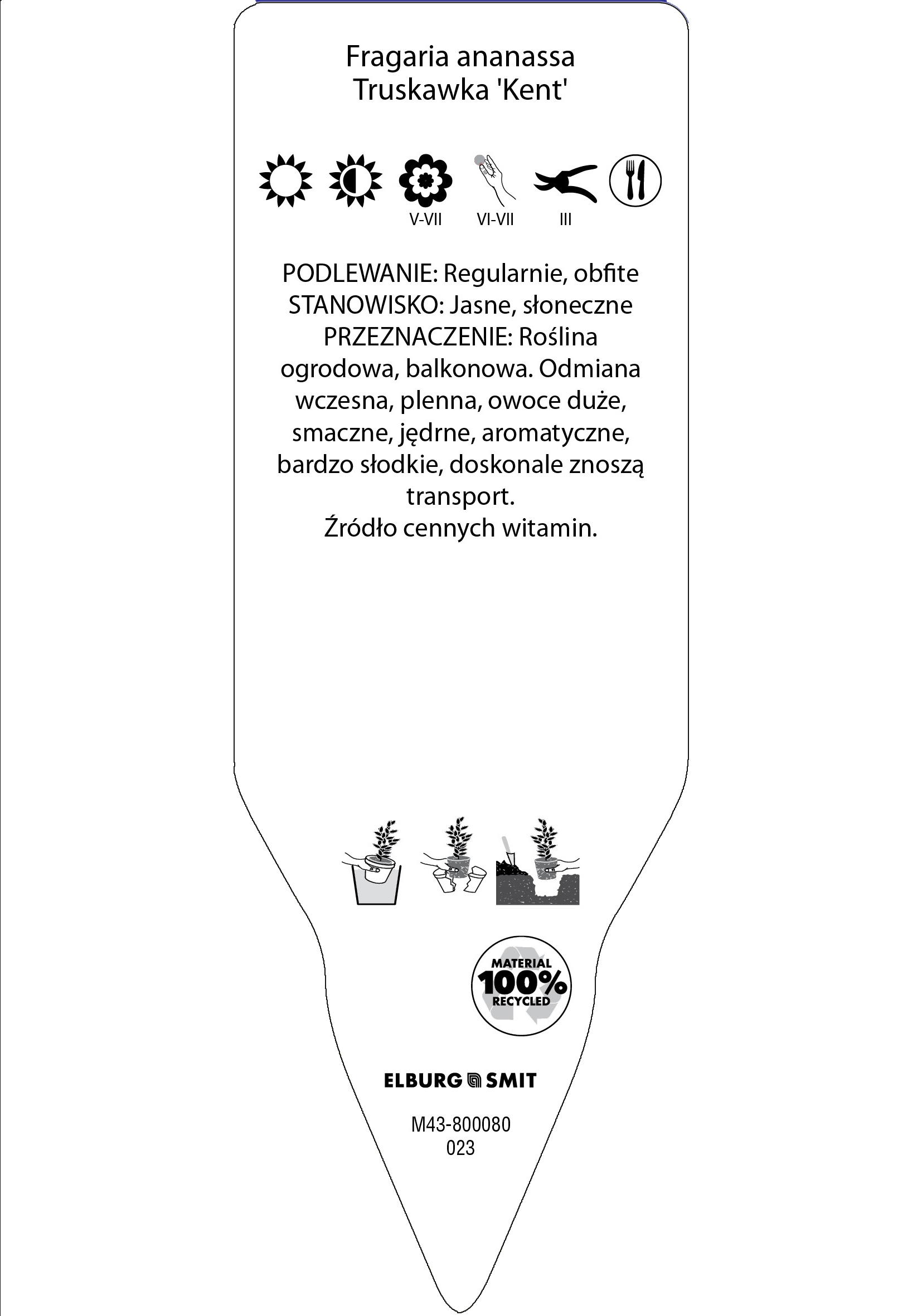 Etykieta wtykana w rozmiarze 35×100 mm. Wykonana z polistyrenu o grubości 0,6 mm w 100% pochodzącego z recyklingu. Etykieta odporna na działanie czynników atmosferycznych. Całość dodatkowo zabezpieczona jest lakierem UV zapobiegającym utracie kolorów.