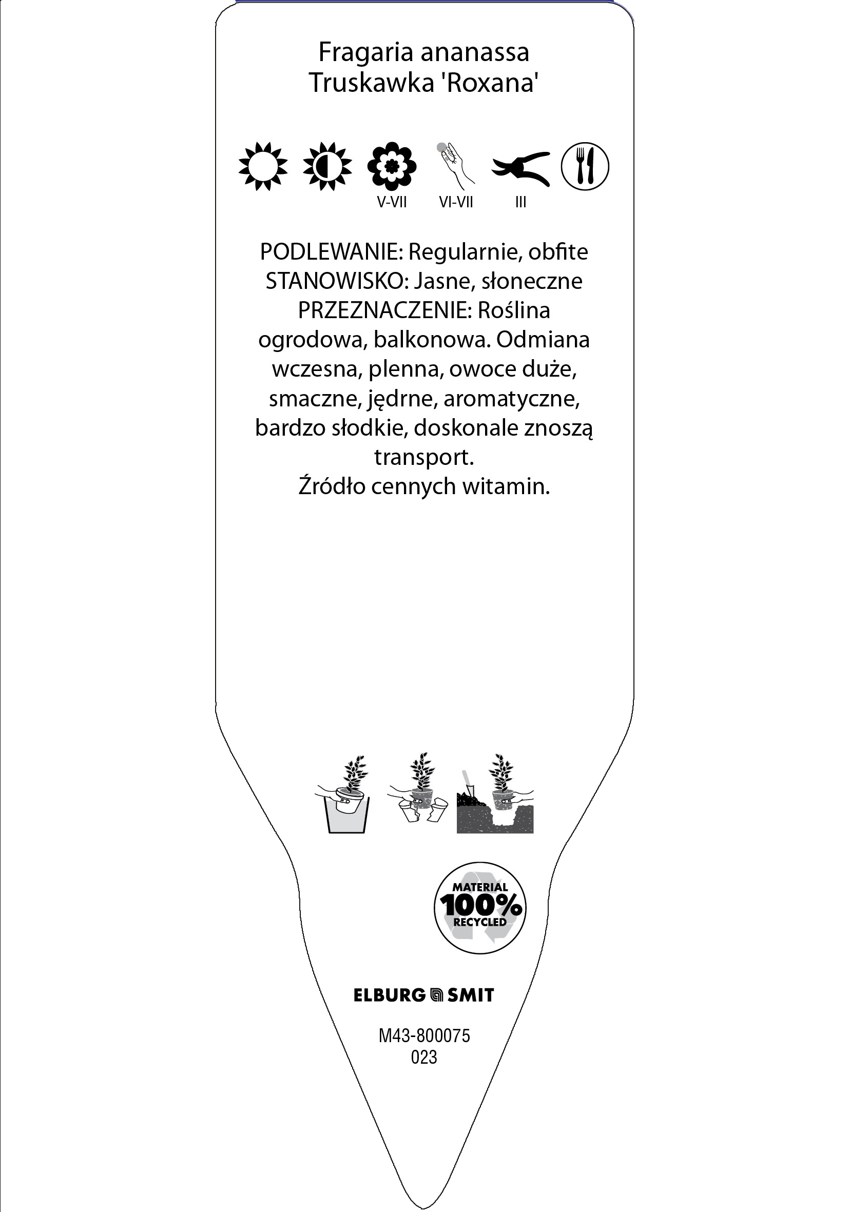 Etykieta wtykana w rozmiarze 35×100 mm. Wykonana z polistyrenu o grubości 0,6 mm w 100% pochodzącego z recyklingu. Etykieta odporna na działanie czynników atmosferycznych. Całość dodatkowo zabezpieczona jest lakierem UV zapobiegającym utracie kolorów.