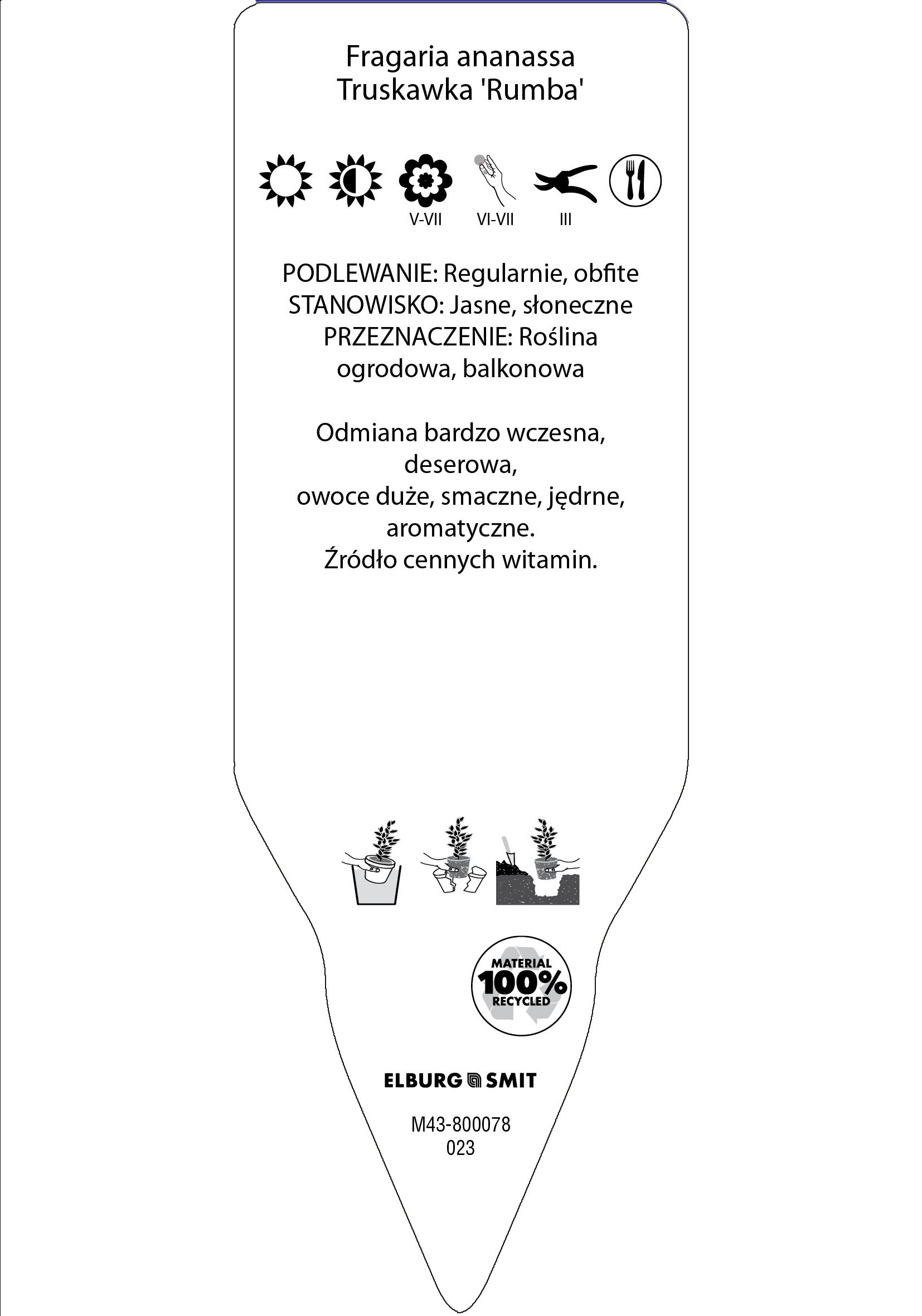 Etykieta wtykana w rozmiarze 35×100 mm. Wykonana z polistyrenu o grubości 0,6 mm w 100% pochodzącego z recyklingu. Etykieta odporna na działanie czynników atmosferycznych. Całość dodatkowo zabezpieczona jest lakierem UV zapobiegającym utracie kolorów.