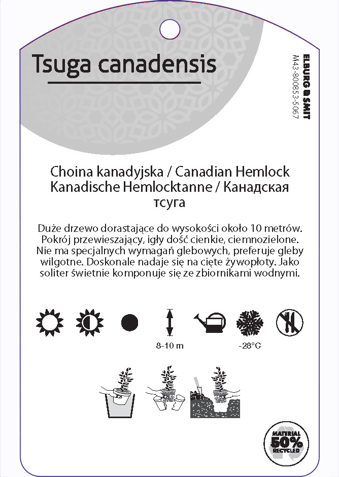 Etykieta zawieszana z gumką w rozmiarze 75×119 mm. Wykonana z polipropylenu o grubości 0,5 mm w 50% pochodzącego z recyklingu. Etykieta odporna na działanie czynników atmosferycznych. Całość dodatkowo zabezpieczona jest lakierem UV zapobiegającym utracie kolorów.