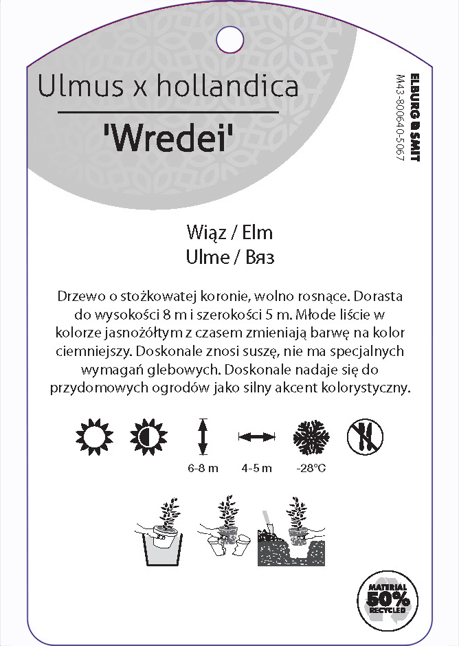 Etykieta zawieszana z gumką w rozmiarze 75×119 mm. Wykonana z polipropylenu o grubości 0,5 mm w 50% pochodzącego z recyklingu. Etykieta odporna na działanie czynników atmosferycznych. Całość dodatkowo zabezpieczona jest lakierem UV zapobiegającym utracie kolorów.