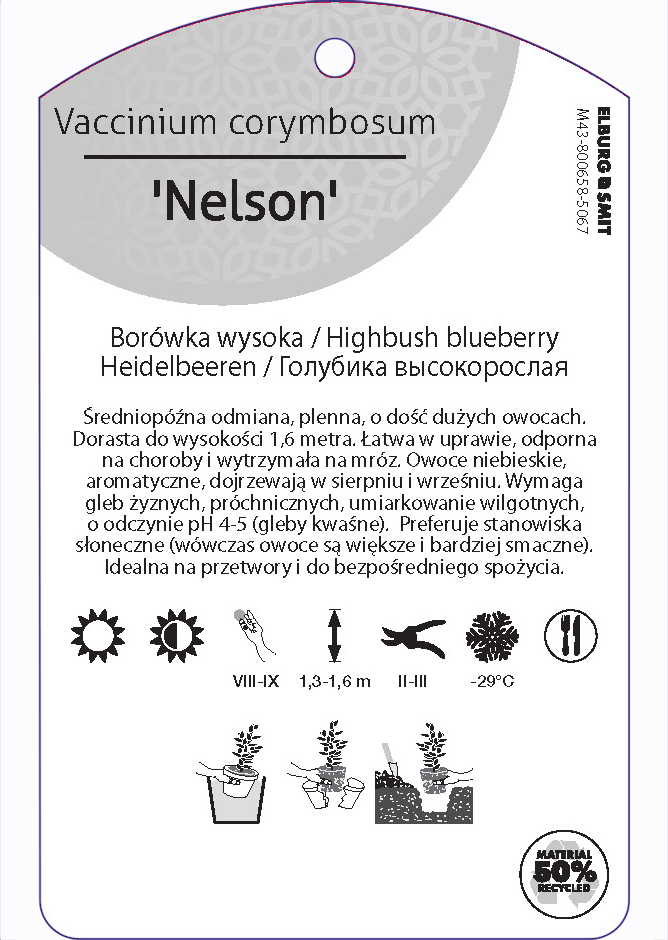 Etykieta zawieszana z gumką w rozmiarze 75×119 mm. Wykonana z polipropylenu o grubości 0,5 mm w 50% pochodzącego z recyklingu. Etykieta odporna na działanie czynników atmosferycznych. Całość dodatkowo zabezpieczona jest lakierem UV zapobiegającym utracie kolorów.