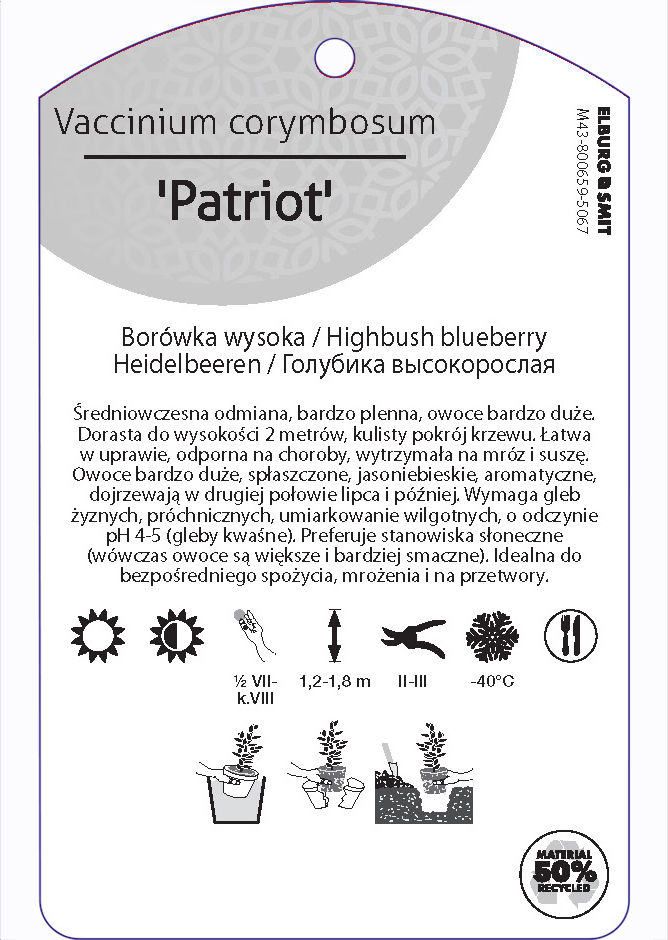 Etykieta zawieszana z gumką w rozmiarze 75×119 mm. Wykonana z polipropylenu o grubości 0,5 mm w 50% pochodzącego z recyklingu. Etykieta odporna na działanie czynników atmosferycznych. Całość dodatkowo zabezpieczona jest lakierem UV zapobiegającym utracie kolorów.