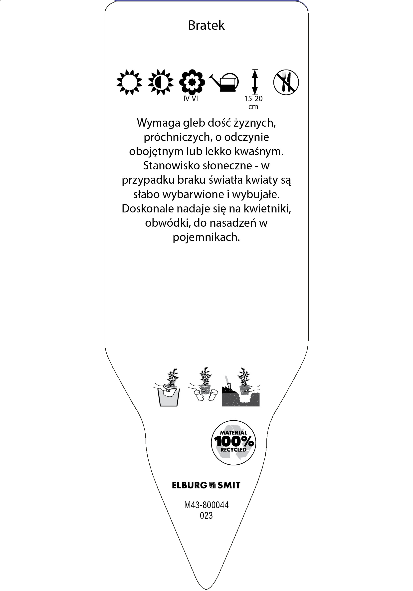Etykieta wtykana w rozmiarze 35×100 mm. Wykonana z polistyrenu o grubości 0,6 mm w 100% pochodzącego z recyklingu. Etykieta odporna na działanie czynników atmosferycznych. Całość dodatkowo zabezpieczona jest lakierem UV zapobiegającym utracie kolorów.