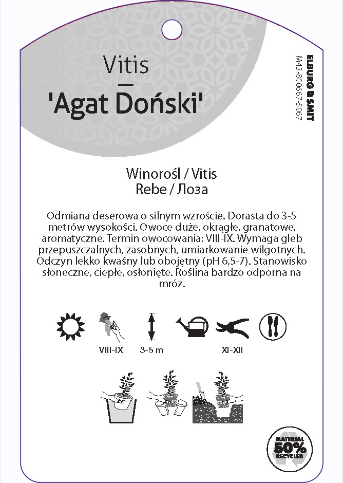 Etykieta zawieszana z gumką w rozmiarze 75×119 mm. Wykonana z polipropylenu o grubości 0,5 mm w 50% pochodzącego z recyklingu. Etykieta odporna na działanie czynników atmosferycznych. Całość dodatkowo zabezpieczona jest lakierem UV zapobiegającym utracie kolorów.
