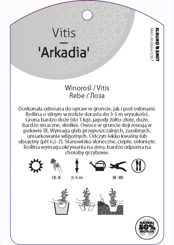 Etykieta zawieszana z gumką w rozmiarze 75×119 mm. Wykonana z polipropylenu o grubości 0,5 mm w 50% pochodzącego z recyklingu. Etykieta odporna na działanie czynników atmosferycznych. Całość dodatkowo zabezpieczona jest lakierem UV zapobiegającym utracie kolorów.