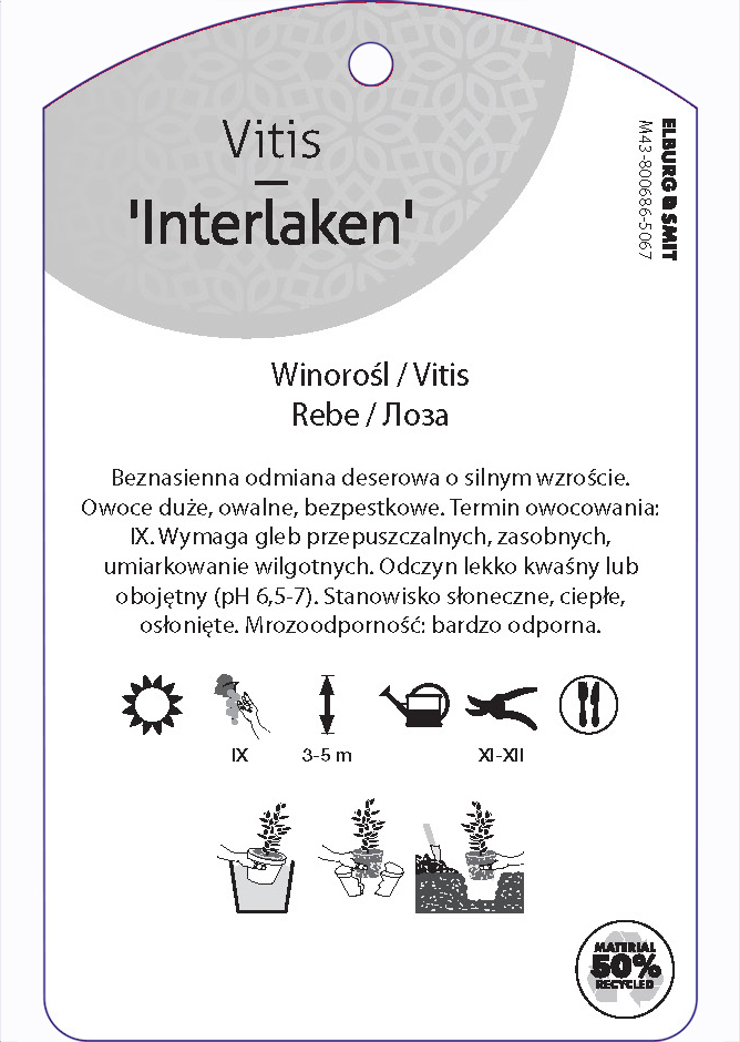 Etykieta zawieszana z gumką w rozmiarze 75×119 mm. Wykonana z polipropylenu o grubości 0,5 mm w 50% pochodzącego z recyklingu. Etykieta odporna na działanie czynników atmosferycznych. Całość dodatkowo zabezpieczona jest lakierem UV zapobiegającym utracie kolorów.