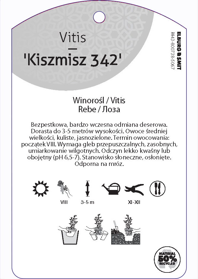 Etykieta zawieszana z gumką w rozmiarze 75×119 mm. Wykonana z polipropylenu o grubości 0,5 mm w 50% pochodzącego z recyklingu. Etykieta odporna na działanie czynników atmosferycznych. Całość dodatkowo zabezpieczona jest lakierem UV zapobiegającym utracie kolorów.