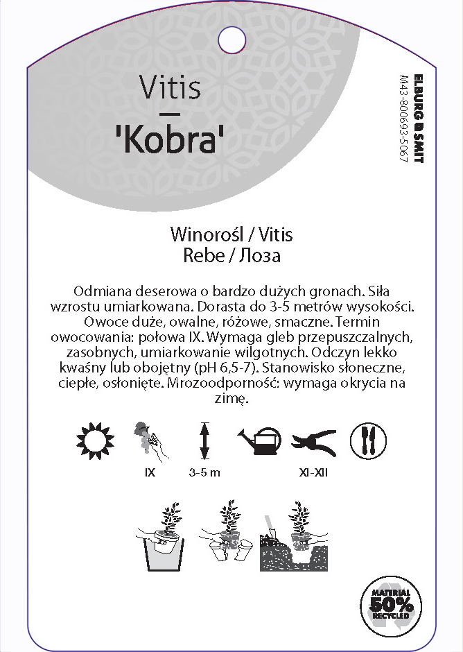 Etykieta zawieszana z gumką w rozmiarze 75×119 mm. Wykonana z polipropylenu o grubości 0,5 mm w 50% pochodzącego z recyklingu. Etykieta odporna na działanie czynników atmosferycznych. Całość dodatkowo zabezpieczona jest lakierem UV zapobiegającym utracie kolorów.