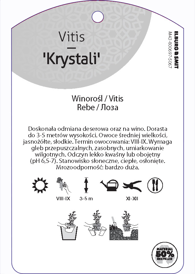 Etykieta zawieszana z gumką w rozmiarze 75×119 mm. Wykonana z polipropylenu o grubości 0,5 mm w 50% pochodzącego z recyklingu. Etykieta odporna na działanie czynników atmosferycznych. Całość dodatkowo zabezpieczona jest lakierem UV zapobiegającym utracie kolorów.