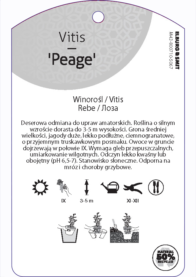 Etykieta zawieszana z gumką w rozmiarze 75×119 mm. Wykonana z polipropylenu o grubości 0,5 mm w 50% pochodzącego z recyklingu. Etykieta odporna na działanie czynników atmosferycznych. Całość dodatkowo zabezpieczona jest lakierem UV zapobiegającym utracie kolorów.