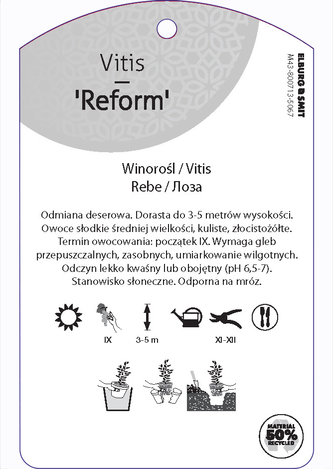 Etykieta zawieszana z gumką w rozmiarze 75×119 mm. Wykonana z polipropylenu o grubości 0,5 mm w 50% pochodzącego z recyklingu. Etykieta odporna na działanie czynników atmosferycznych. Całość dodatkowo zabezpieczona jest lakierem UV zapobiegającym utracie kolorów.