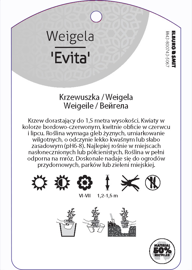 Etykieta zawieszana z gumką w rozmiarze 75×119 mm. Wykonana z polipropylenu o grubości 0,5 mm w 50% pochodzącego z recyklingu. Etykieta odporna na działanie czynników atmosferycznych. Całość dodatkowo zabezpieczona jest lakierem UV zapobiegającym utracie kolorów.