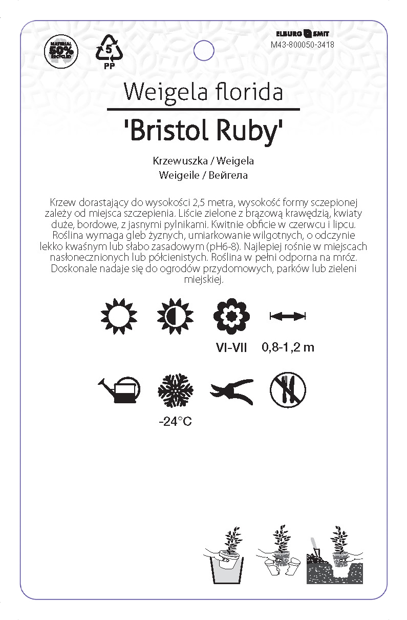 Etykieta zawieszana z gumką w rozmiarze 92×145 mm. Wykonana z polipropylenu o grubości 0,5 mm w 50% pochodzącego z recyklingu. Etykieta odporna na działanie czynników atmosferycznych. Całość dodatkowo zabezpieczona jest lakierem UV zapobiegającym utracie kolorów.