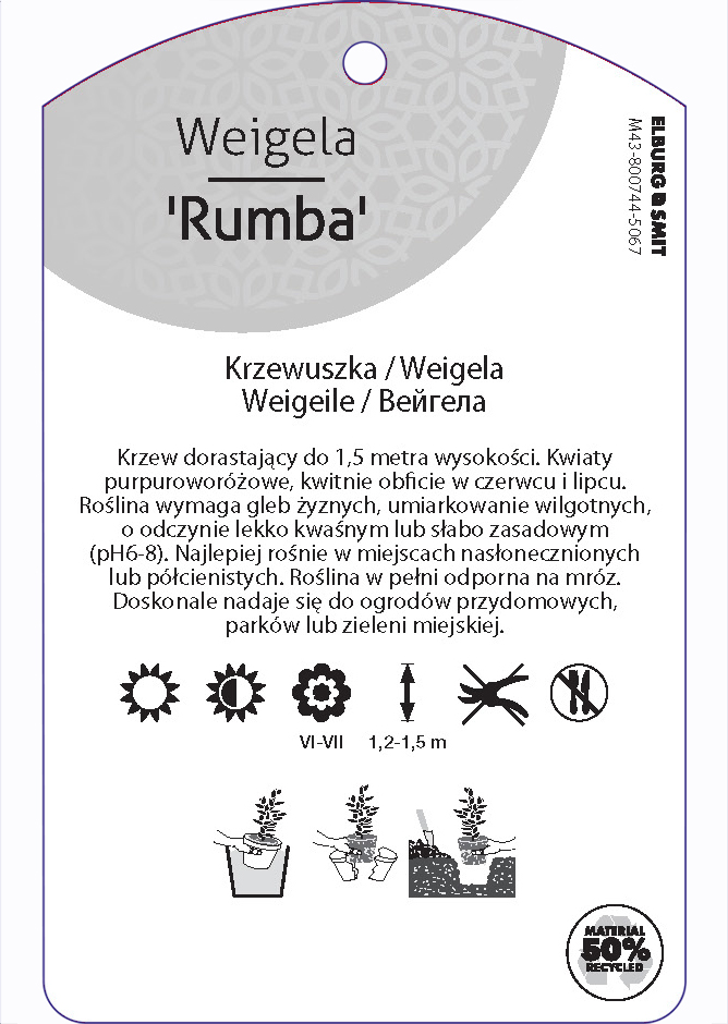 Etykieta zawieszana z gumką w rozmiarze 75×119 mm. Wykonana z polipropylenu o grubości 0,5 mm w 50% pochodzącego z recyklingu. Etykieta odporna na działanie czynników atmosferycznych. Całość dodatkowo zabezpieczona jest lakierem UV zapobiegającym utracie kolorów.