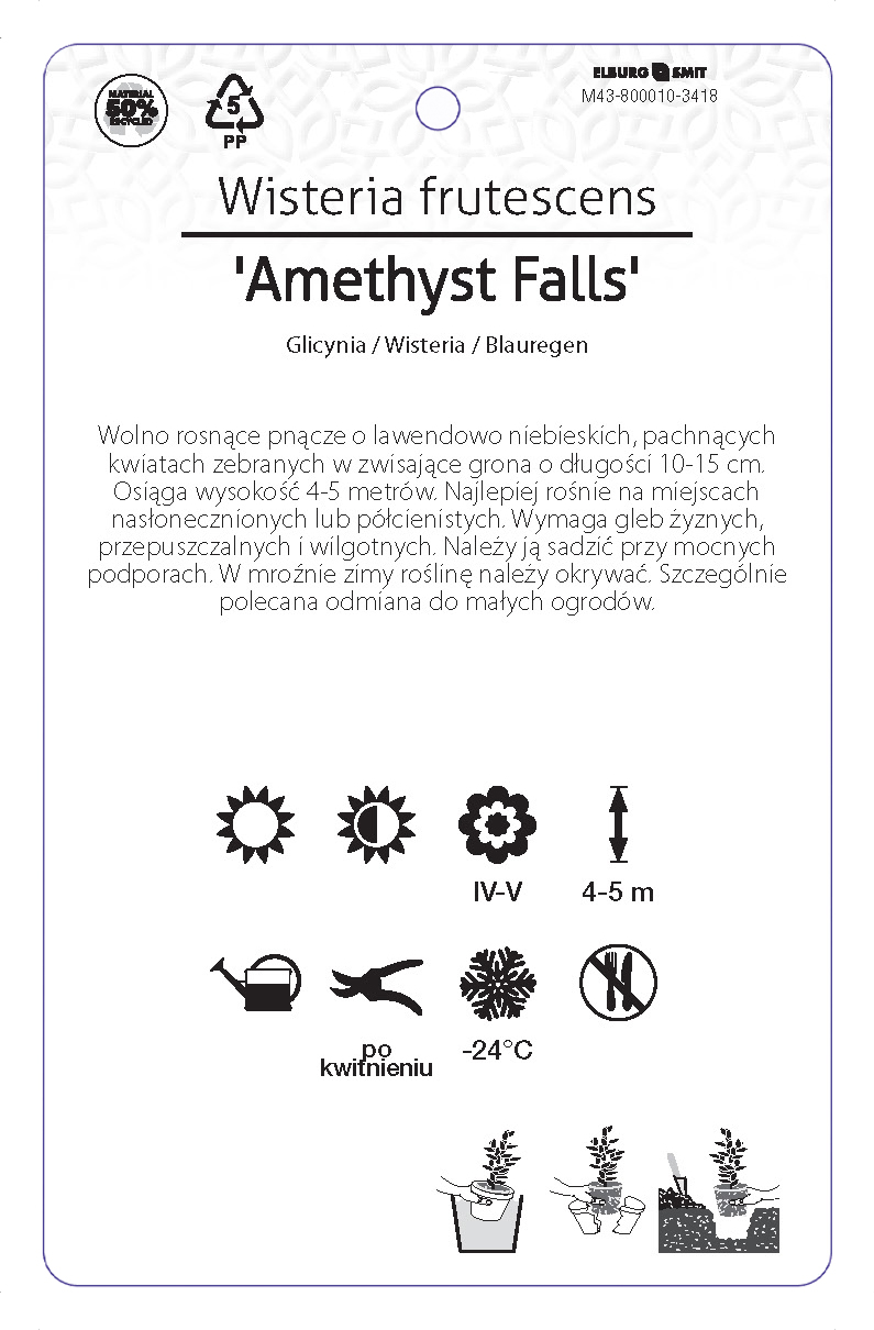 Etykieta zawieszana z gumką w rozmiarze 92×145 mm. Wykonana z polipropylenu o grubości 0,5 mm w 50% pochodzącego z recyklingu. Etykieta odporna na działanie czynników atmosferycznych. Całość dodatkowo zabezpieczona jest lakierem UV zapobiegającym utracie kolorów.