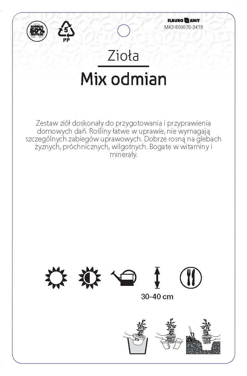 Etykieta zawieszana z gumką w rozmiarze 92×145 mm. Wykonana z polipropylenu o grubości 0,5 mm w 50% pochodzącego z recyklingu. Etykieta odporna na działanie czynników atmosferycznych. Całość dodatkowo zabezpieczona jest lakierem UV zapobiegającym utracie kolorów.
